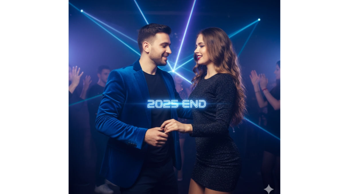 Realistic dance floor moment with blue and purple lasers cutting through the fog. A stylish man wearing a royal blue velvet jacket and black t-shirt dances with a beautiful Russian girl in a short black glitter dress. Motion blur of crowd behind, natural skin texture, cinematic lighting. Hologram text in air: ‘2025 END’. Replace the man’s face with my real photo.