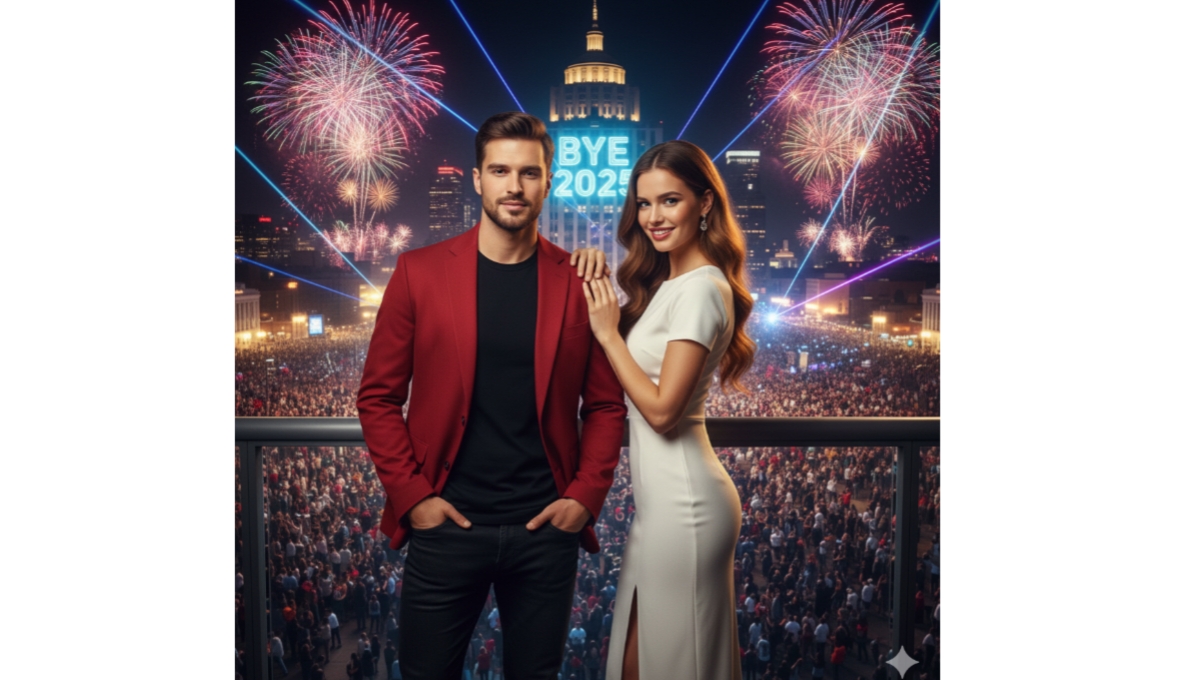 Ultra-HD balcony shot overlooking a massive New Year crowd. Man wearing a stylish red designer jacket and black denim stands with a smiling Russian woman in a classy white dress. Below them, thousands dance under fireworks and lasers. Glass railing reflections, cinematic city lights, neon sign: ‘BYE BYE 2025’. Replace the man’s face with my real photo.