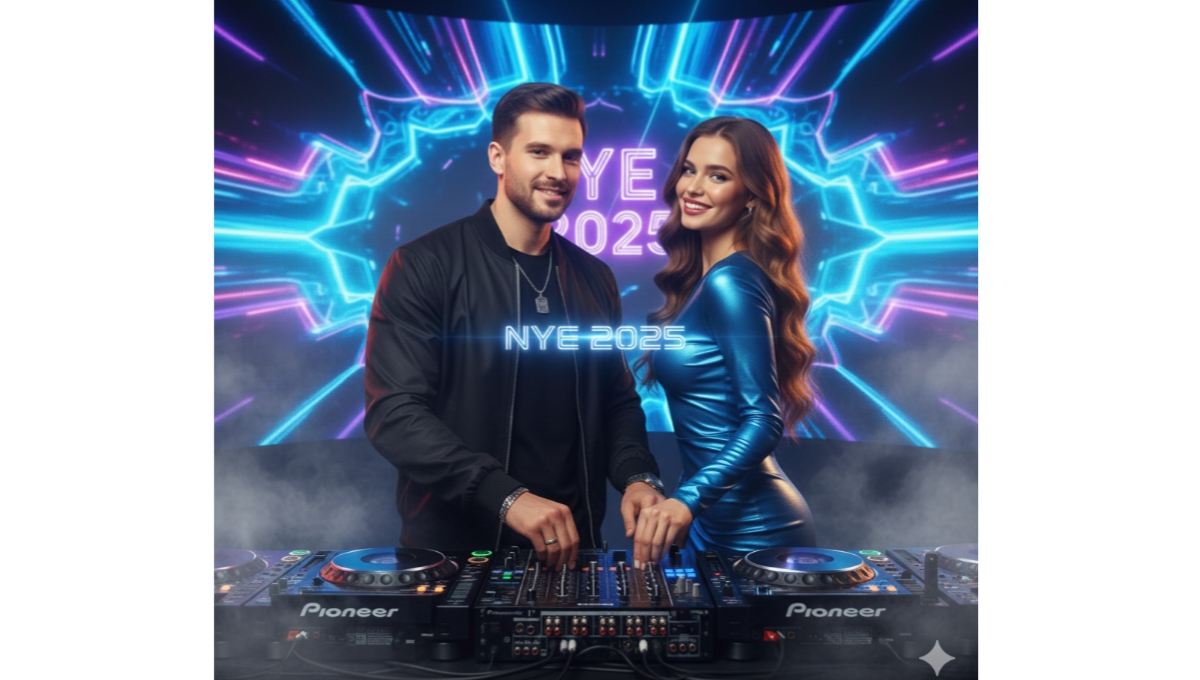 Realistic DJ booth portrait with LED panels flashing behind. Man wearing luxury all-black streetwear (black bomber jacket, fitted tee, chain). Russian girl in a shiny blue bodycon dress stands beside him with a playful expression. DJ console lights reflect on their faces, fog haze around. Neon text: ‘NYE 2025’. Replace face with my real photo.