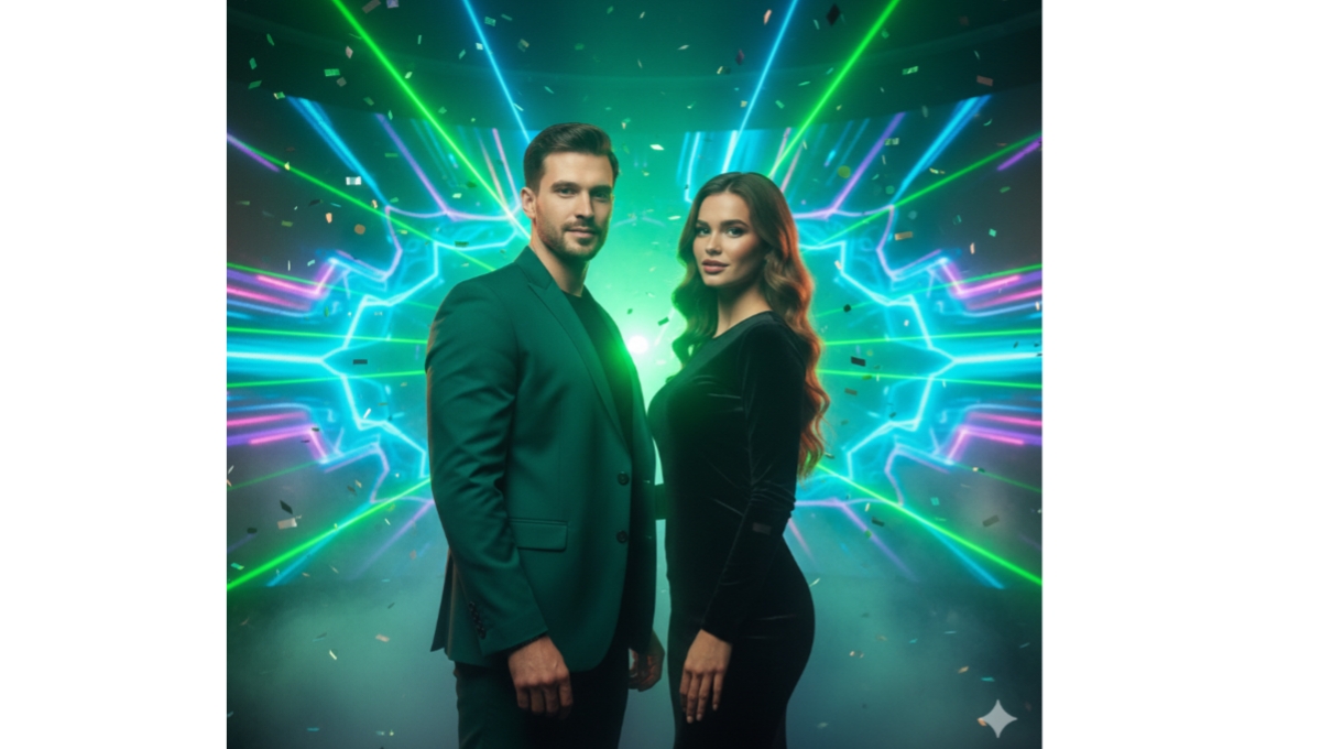 Cinematic silhouette shot filled with thick fog and vibrant green/blue laser beams. A man wearing a premium emerald green suit stands confidently next to a beautiful Russian girl in a black velvet dress. Sharp facial glow, confetti in the air, high-budget nightclub look. Replace the man’s face with my real photo.