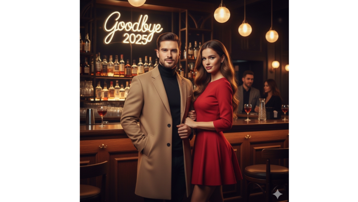 Ultra-realistic nightclub café-bar portrait. Man in a luxury beige overcoat and black turtleneck stands at the counter with a Russian girl wearing a red cocktail dress. Warm bar lights create golden reflections on bottles. Elegant neon text: ‘GOODBYE 2025’. Replace man’s face with my real photo.