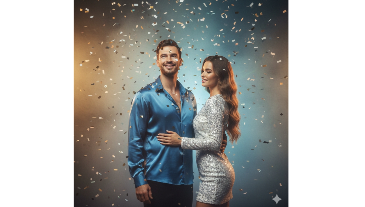 Slow-motion hyper-clear confetti rain portrait. Man wearing a shiny blue silk shirt smiles upward while a graceful Russian girl in a white sequin mini dress holds his arm. Confetti illuminated by gold and blue spotlights, soft fog, natural skin texture, cinematic depth. Replace the man’s face with my real photo.