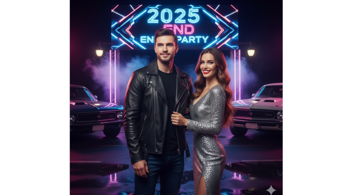 Nightclub outdoor parking party scene with neon lights glowing on cars. Man in a premium black leather jacket and dark jeans stands with a Russian girl in an elegant long silver dress. Blue/pink light reflections, realistic shadows, party smoke. LED sign behind: ‘2025 END PARTY’. Replace man’s face with my real photo.