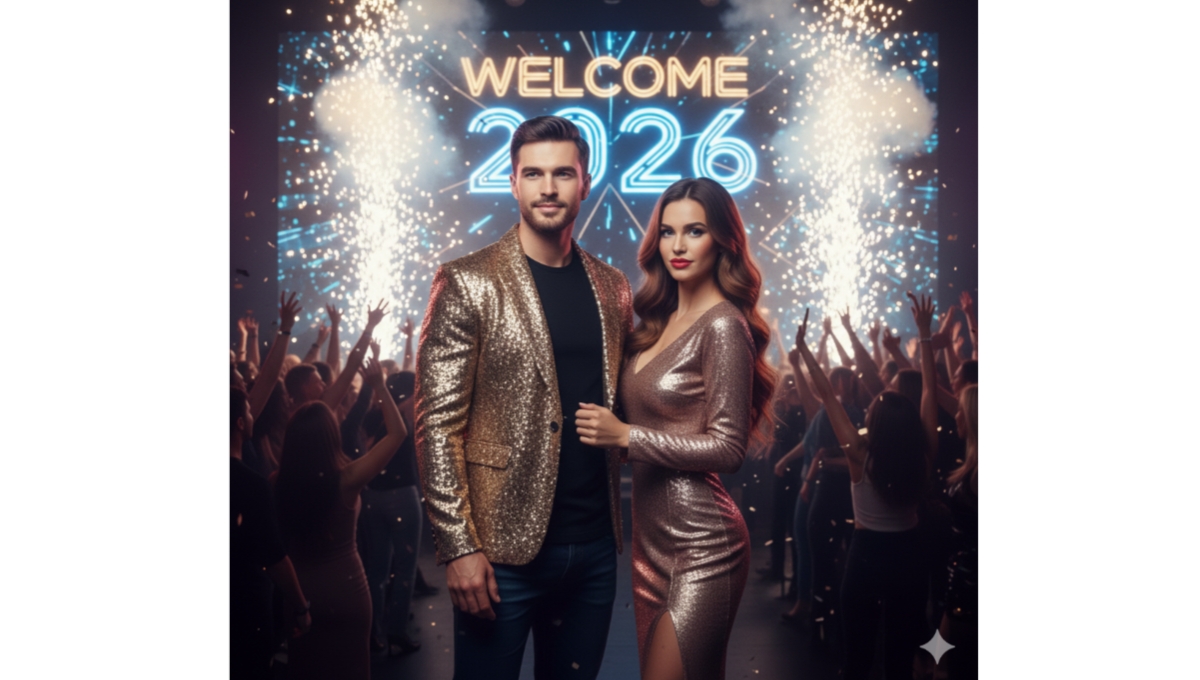 Ultra-premium nightclub moment with indoor cold-fire fireworks erupting from the stage. Man wearing a shiny gold party jacket and black chinos stands with a stunning Russian girl in a metallic rose-gold dress. Sharp lighting, realistic reflections, festive energy. LED wall displays: ‘WELCOME 2026’. Replace the man’s face with my real photo.