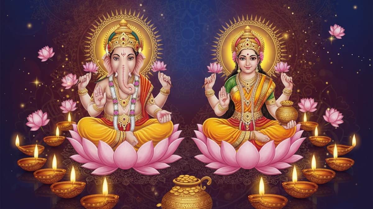 Divine Diwali poster featuring Lord Ganesha and Goddess Lakshmi in artistic style, diyas, lotus, glowing aura, traditional patterns, peaceful background