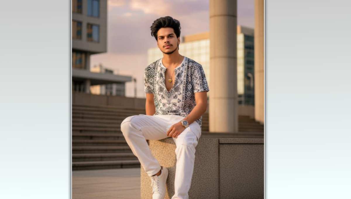 Create Ultra-realistic Stylish young man sitting outdoors on a large stone block, posing confidently with one hand on the block and one leg raised. He has voluminous, same no hair, and wears a vibrant, white and black printed shirt with a deep neckline, light White denim cargo jeans, and white sneakers. premium luxury watch,gold chain with small heart pendant, The cool background features tall modern pillars, stone steps, and urban buildings under soft golden hour