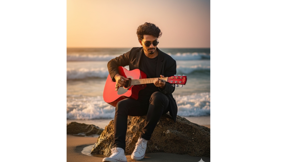 A young man sitting casually on a rock at the beach, legs gently hanging down, playing a red acoustic guitar with calm musical focus. Wearing a textured black jacket, black t-shirt, black pants, and white high-top sneakers. Natural curly hairstyle, wearing black stylish sunglasses, soft sea breeze moving hair, peaceful expression. Bright ocean waves behind him, golden sunlight illuminating his face and guitar, hyper-realistic sand and rock texture, cinematic low-angle perspective, smooth bokeh, editorial composition, volumetric warm light, ultra detailed guitar reflections, premium photography, 8K hyper-realistic cinematic look, dynamic depth of field, natural skin texture. Keep the face exactly the same as the uploaded photo — do not alter or redesign the face.