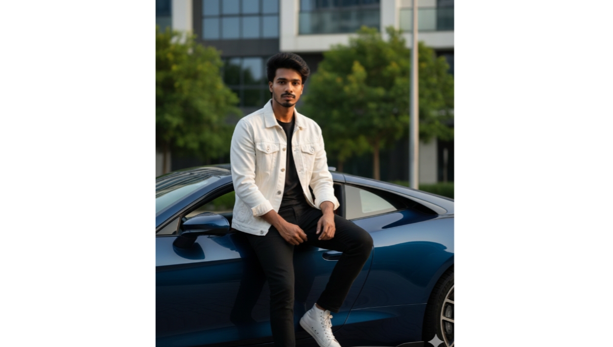 8K hyper realistic cinematic portrait of a stylish young man sitting on the side of a luxury dark-blue sports car, same exact face as in the reference photo (do not alter the face), natural hairstyle, confident relaxed attitude, one hand resting on his knee, other hand casually hanging down, white denim jacket, black t-shirt, dark pants, white sneakers, fashion lifestyle pose, soft golden sunlight, high-detail textures on clothes, premium car reflections, modern building background with rich green trees, shallow depth of field, ultra-clear lens bokeh, Sony A7R V photography style, volumetric lighting, crisp realistic shadows, photoreal skin texture, cinematic tone mapping, luxury aesthetic composition, premium lifestyle scene, ultra-realistic proportions, dramatic yet clean look.Keep the original face exactly the same as the reference. Do NOT change facial features, proportions, expression, or skin.“Create an ultra-realistic 8K cinematic portrait selfie outdoors near a wooden fence, with a grassy park and street lights in the background.