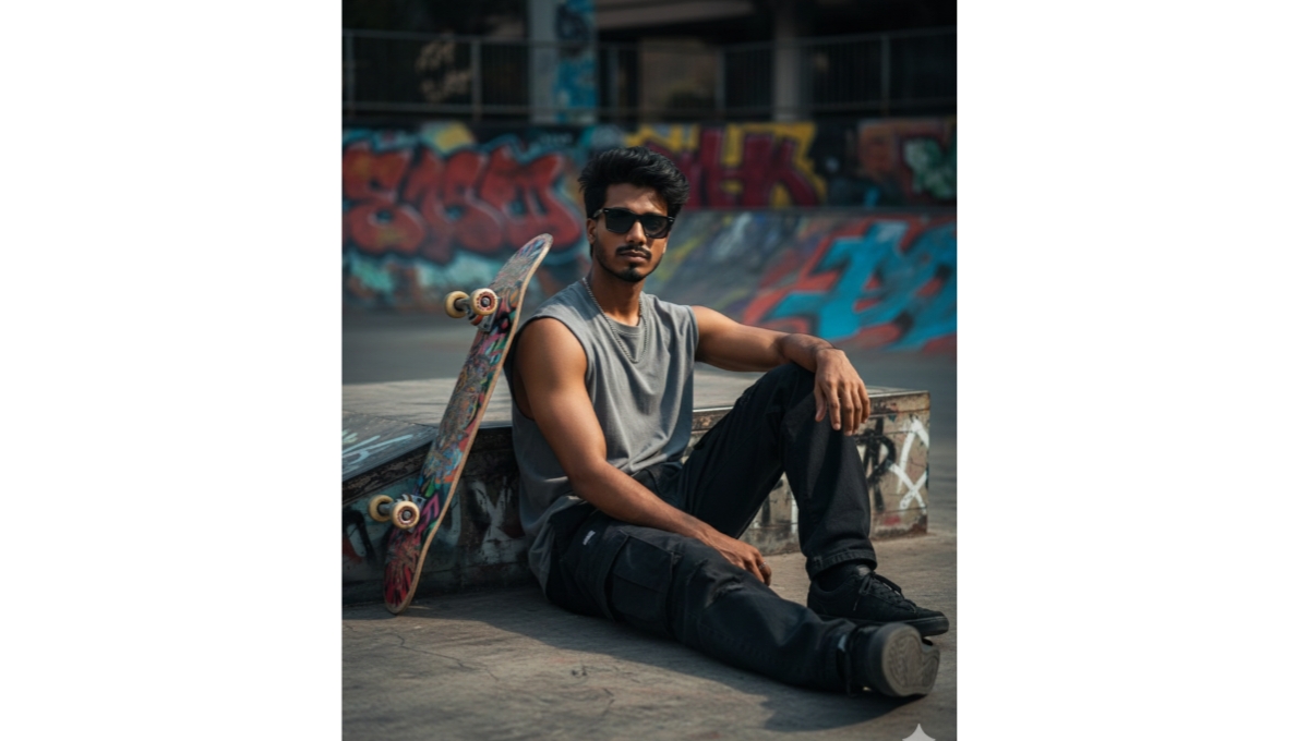 8K hyper-realistic cinematic full-body portrait of a 20-year young handsome man with a slim, athletic body — KEEP HIS FACE EXACTLY THE SAME as in the reference photo with no changes to facial structure, skin tone, or expression. No cap. Create a completely new stylish attitude pose: the man is sitting on the ground with one knee up, skateboard resting beside him or slightly tilted against his leg, giving a relaxed but confident street-style look. Urban graffiti skatepark environment, vibrant color grading, dramatic cinematic lighting, sharp shadows, ultra-detailed textures, smooth depth of field. Outfit: sleeveless grey shirt, sunglasses, silver chain, baggy cargo jeans, black skate shoes.
