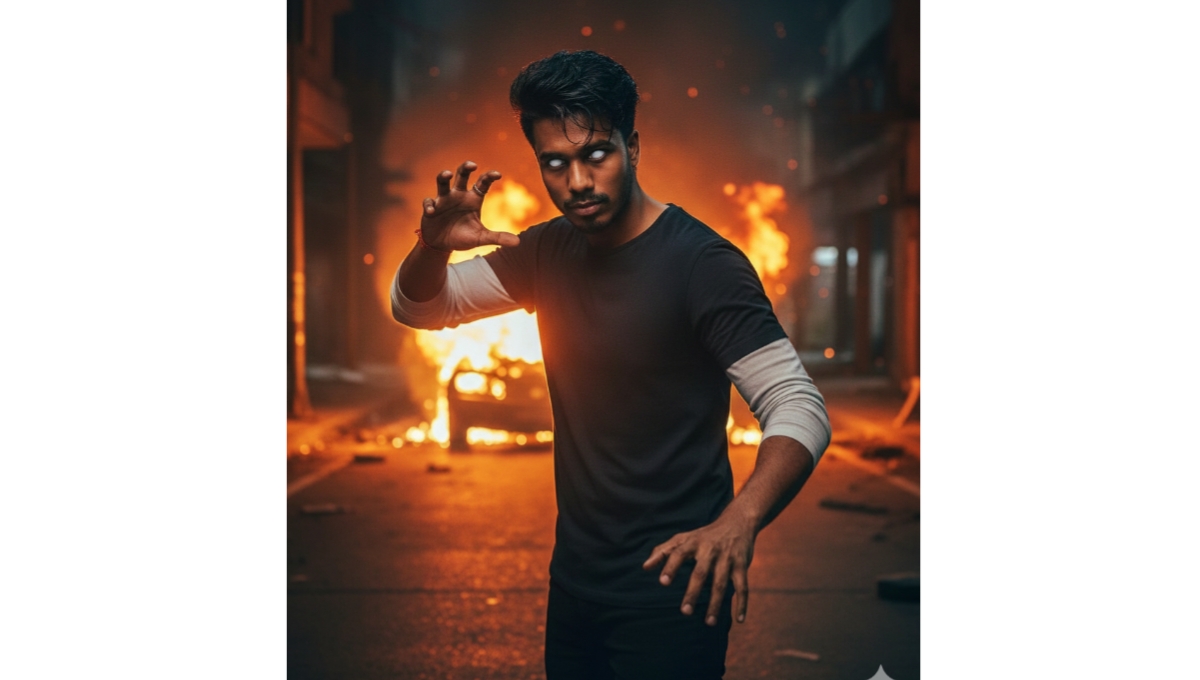 Create a realistic, high-quality cinematic photo using the face from the reference photo WITHOUT altering, modifying, or distorting the face in any way.Scene Description:A dark, cinematic shot of a young man (around 30) standing on a ruined, apocalyptic urban street at night. A massive raging fire behind him acts as the main dramatic light source, creating harsh backlighting and fiery highlights. The mood is intense, chaotic, and supernatural — inspired by Stranger Things 5. Character:Young man, around 30.Short, slightly tousled, slightly damp hair.Expressive eyes. Makeup: Eyes completely white — no pupils or irises — giving a possessed, trance-like supernatural look.Clothing:Dark T-shirt with long white sleeves. NEW Pose (Stranger Things 5 style): Character is facing the camera, but with a slight body turn to the side.Chin slightly lowered, giving a menacing powered-up look.Right hand raised near chest level, fingers spread and bent as if controlling energy in the air.Left hand extended outward to the side, palm facing down, fingers tense — as if stabilizing or channeling a second force.Subtle supernatural tension in both arms and shoulders.Small debris or particles subtly floating around him due to telekinetic power. Emotion:Intense focus with a slight squint.Tight jaw and firm lips.Expression of rage, determination, and supernatural force building up.Lighting & Atmosphere:Strong contrasty firelight from behind and side.Warm orange, red, and yellow tones.Hard shadows, glowing edges. Smoke, particles, atmospheric haze. Supernatural aura vibe (without glowing effects on the face).Background:Large burning vehicle or building behind him. Dark broken asphalt street. Faint silhouettes of debris, destruction, or bodies.Style:Cinematic, hyper-realistic, ultra sharp. Professional color grading. Looks like a frame from Stranger Things 5. No anime, no CGI look, no 3D render, no illustration, no soft beauty filter, no plastic skin.Special Requirement: KEEP MY FACE EXACTLY THE SAME AS THE REFERENCE PHOTO — do NOT change, alter, modify, or distort the face.