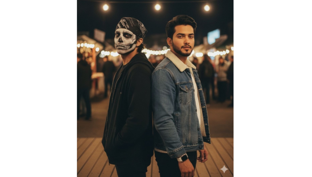 Create an ultra-realistic 8K cinematic portrait featuring two people using the exact faces from reference photo 1 (left) and reference photo 2 (right).Identity, facial features, expressions, eyes, lips, nose, jawline, skin tone, pores, micro-texture, and imperfections must remain unchanged. No smoothing, no beautification, no AI plastic look. New Pose (Fresh & Stylish): Both subjects are leaning back-to-back, standing close with shoulders touching. – Friend (reference 1): on the left side, body turned slightly right, looking calmly off-camera with a relaxed expression. – You (reference 2): on the right side, body turned slightly left, looking directly into the camera with a confident neutral expression. Hands relaxed near pockets; natural posture, no stiffness. Pose mood: cool, cinematic duo pose — stylish and confident. New Background & Setting: – Outdoor night scene with soft glowing lantern lights hanging above.– Wooden deck flooring below, blurred street market ambiance behind them. – Warm golden bokeh orbs, faint crowd silhouettes, atmospheric depth.Lighting: – Warm overhead lantern lighting casting soft highlights on hair and cheeks. – Subtle side lighting shaping the jawline and preserving pore-level detail.– Natural shadows, realistic skin tone, visible texture, no filters, no over-smoothing. Clothing (same as always): – Friend (left): dark zip hoodie over a black shirt. – You (right): fur-lined denim jacket, white T-shirt, white Apple Watch. Technical Style:– Shot on a 50mm cine lens with shallow depth of field. – True DSLR realism, rich cinematic contrast, natural grain. – Zero modification to the original facial identity or expression.