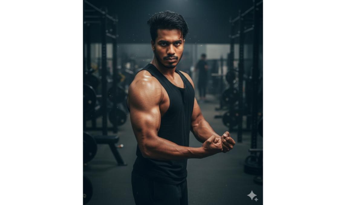 4K ultra-detailed gym portrait of a muscular man, sweaty skin texture, intense look, high clarity, dramatic shadows, fitness model style. Best for: Fitness pages, motivation posts.