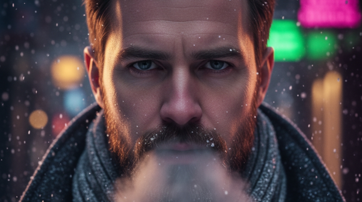 Close-up winter portrait with visible warm breath fog, snowflakes on beard, soft cold lighting, ultra-sharp skin texture, 4K realism.
