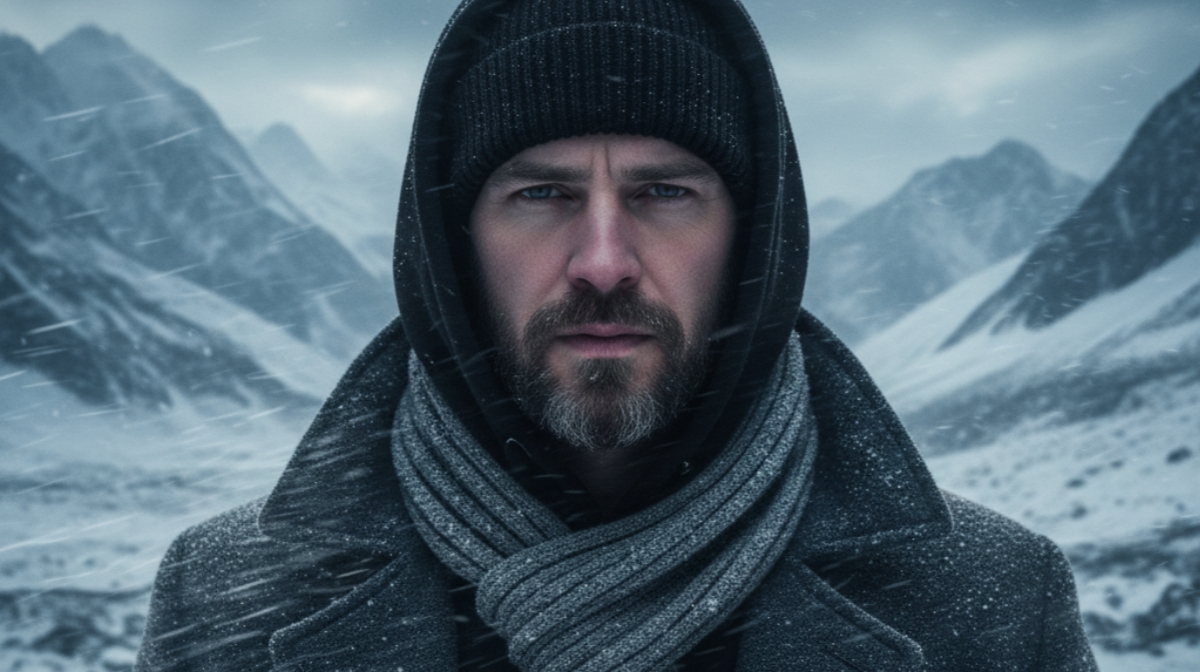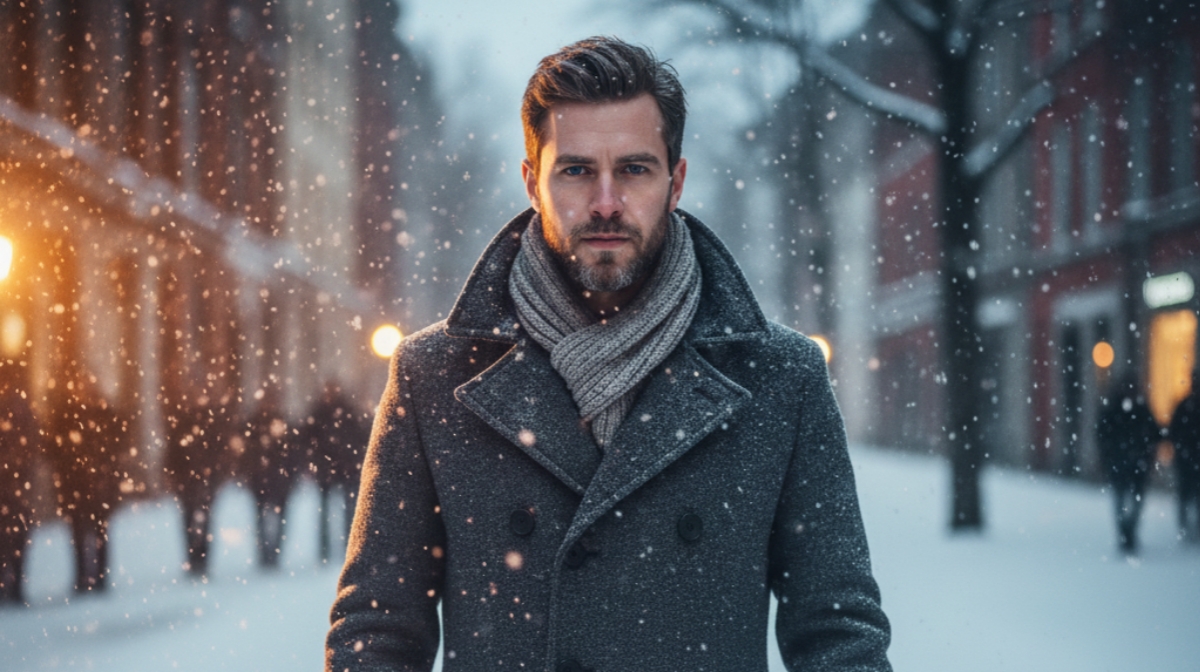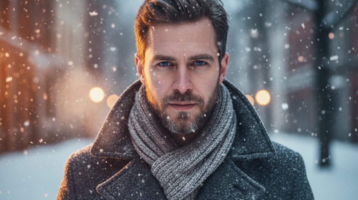 Cinematic winter portrait of a man in a wool overcoat, soft snowfall, warm skin light, sharp jawline, subtle beard detailing, 4K ultra-realistic.