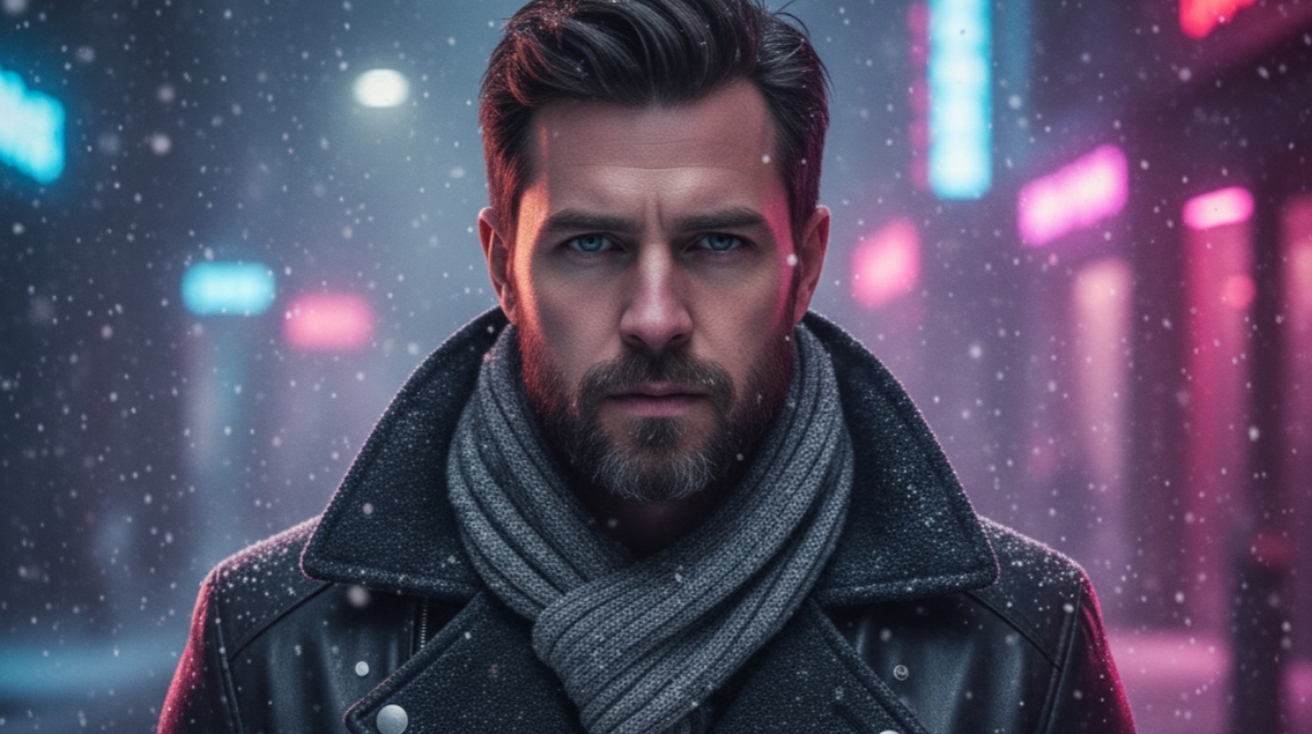 Man walking in a cold street, neon reflections, winter fog, black leather jacket, dramatic cinematic tones, ultra-sharp 4K close-up.