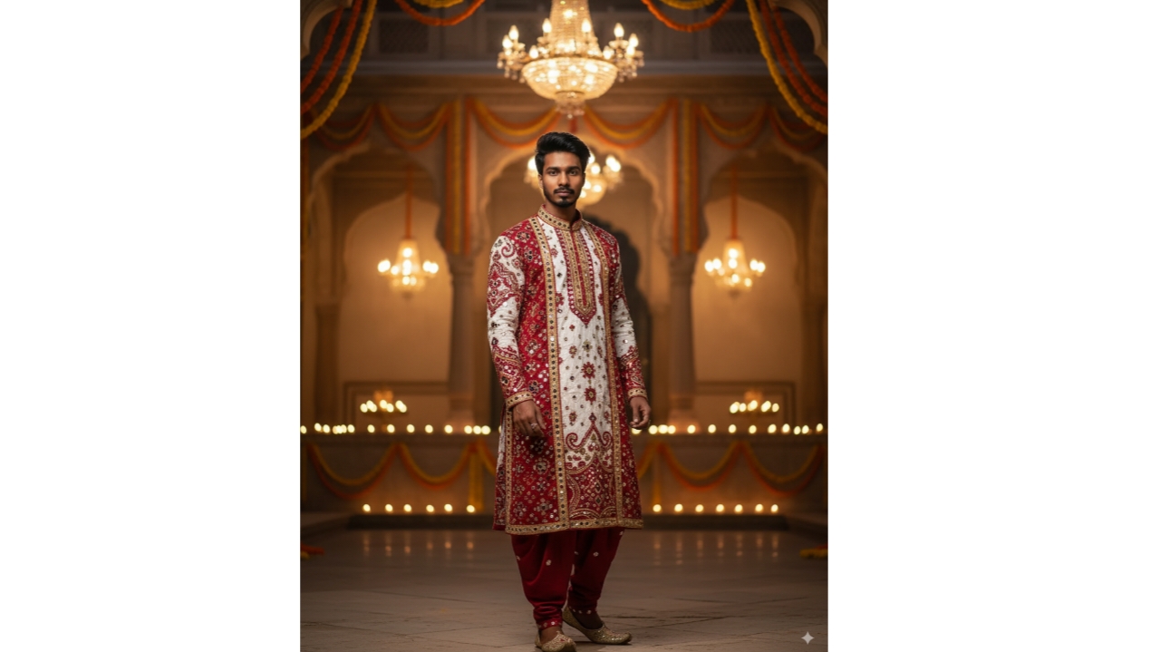 Ultra-realistic cinematic full-body portrait of a 22-year-old slim man (5’4″), same face and perfectly styled hair. He is wearing a white and red traditional dandiya outfit with intricate mirror embroidery, golden borders, and matching footwear. He stands confidently in a palace courtyard decorated with marigold flowers, candles, and soft glowing chandeliers in the background.