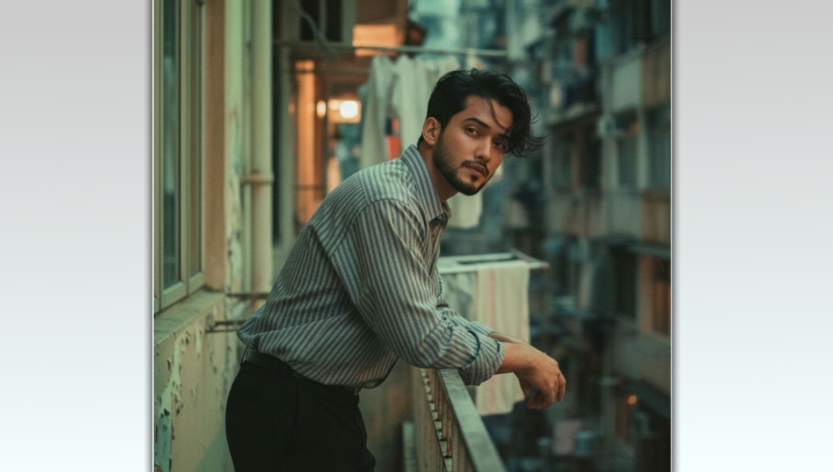 Retro Hong Kong indoor/outdoor story portrait, face 100% same. Leaning on a narrow balcony railing, hair tousled by the wind, expression calm and reflective. Wearing a gray striped loose shirt and black trousers, a casual, relaxed style.