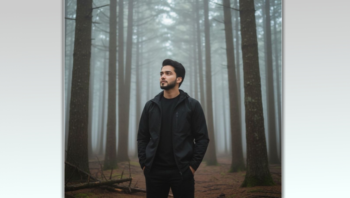 A young man stands in a dense, misty pine forest, captured in ultra-detailed 8K hyper-realistic cinematic style. His face must remain exactly the same as in the reference photo, with no changes or alterations. He is wearing a black outdoor outfit, with both hands in his pockets, looking upward thoughtfully. The tall pine trees create dramatic vertical depth, and soft diffused light filters through the forest canopy. The ground is slightly damp, adding natural texture. Use a shallow depth of field for crisp subject clarity, along with soft atmospheric background blur.
